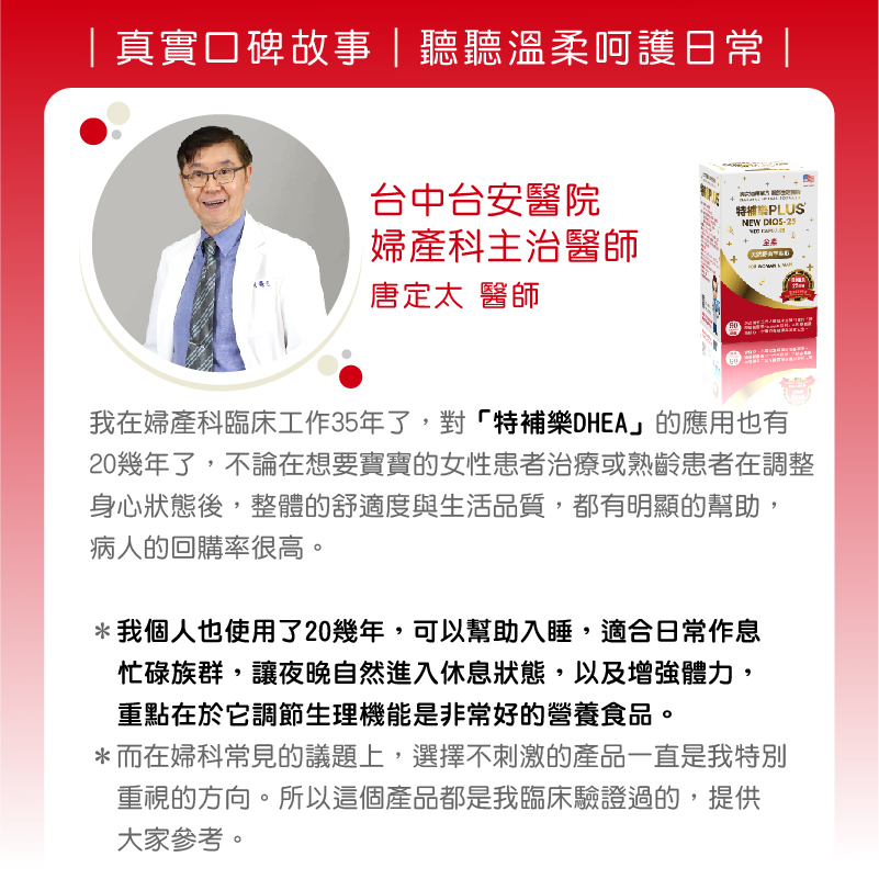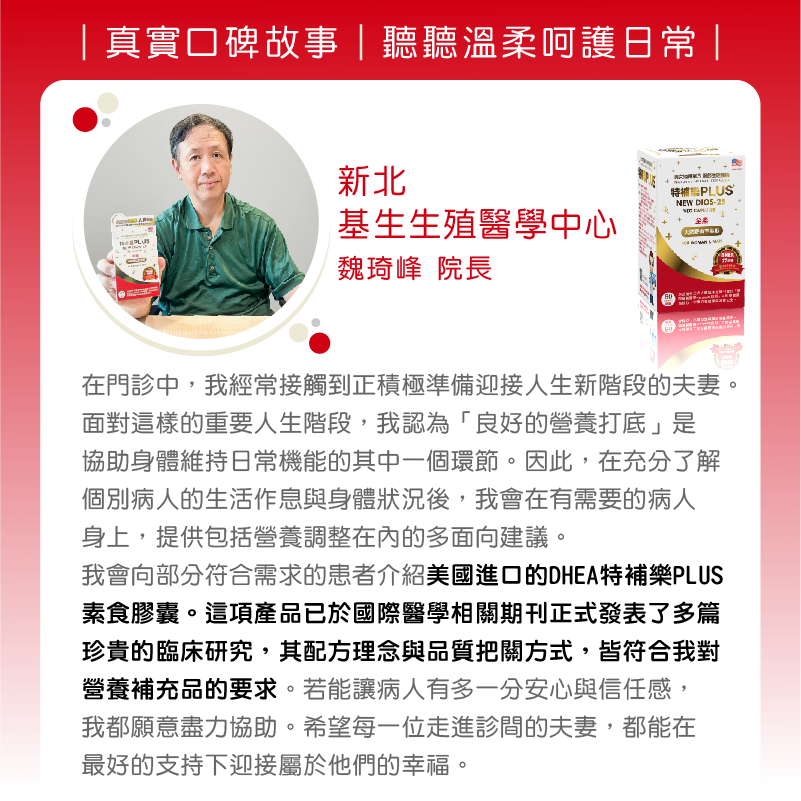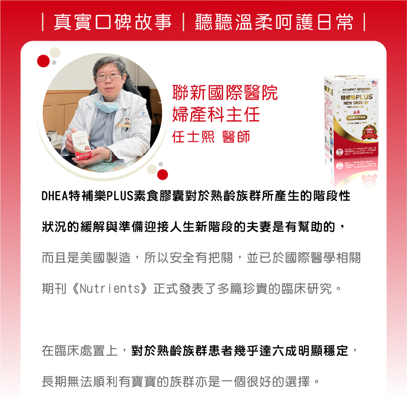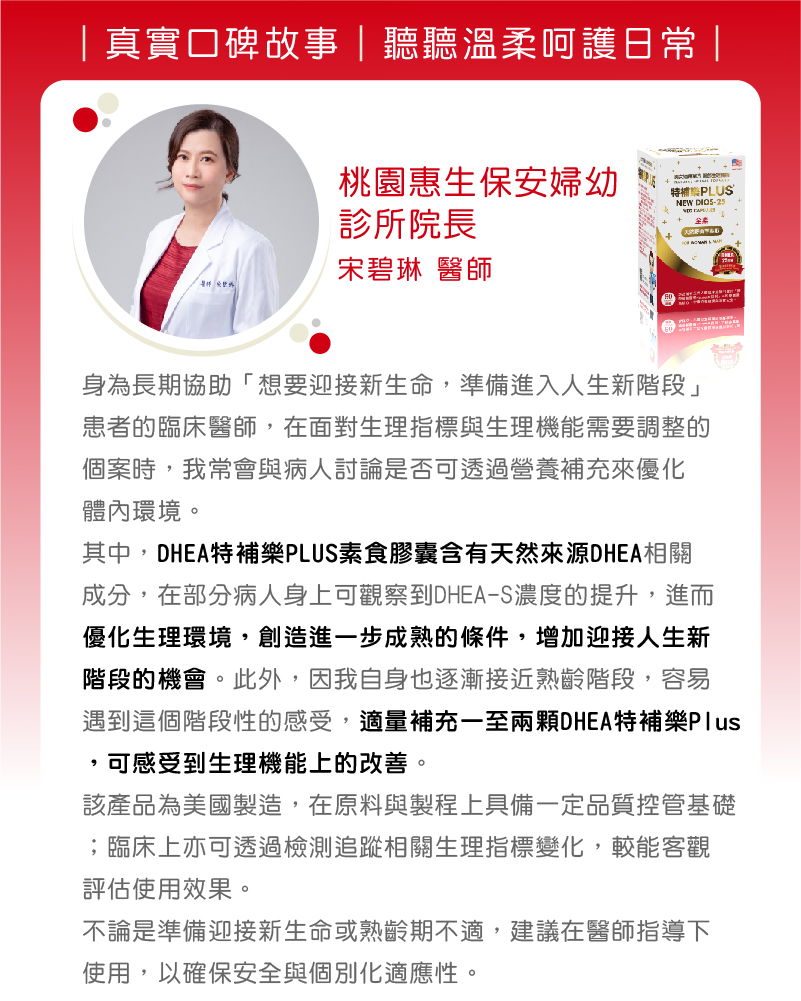 我在婦產科臨床工作35年了,對「特補樂DHEA」的應用也有20幾年了,不論在想要寶寶的女性患者