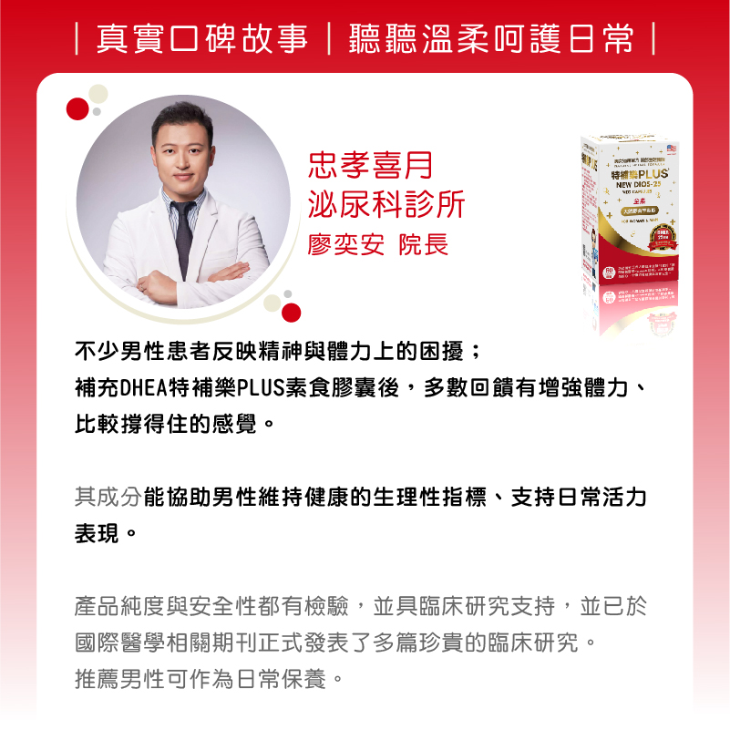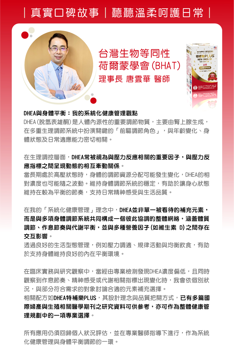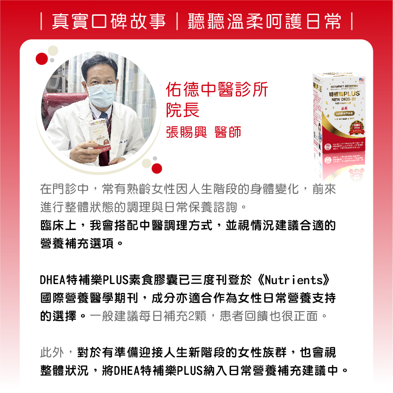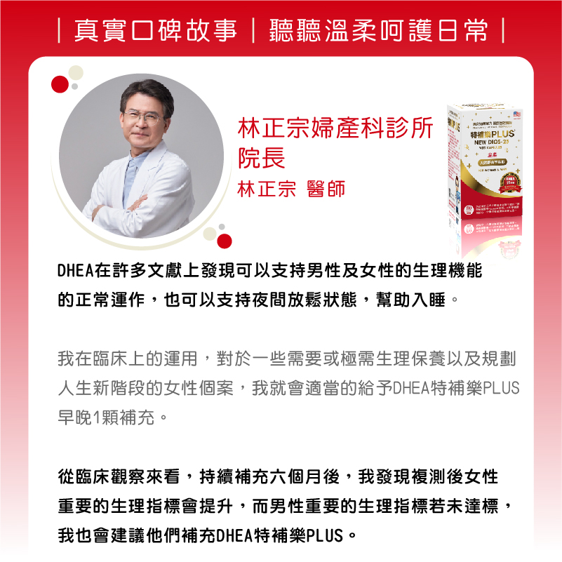 在臨床建議上,我會依據個別狀況,搭配使用DHEA特補樂PLUS素食膠囊作為日常營養補充的