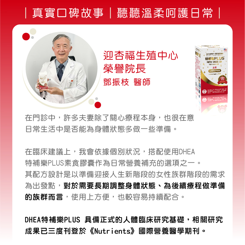 相關配方如 DHEA特補樂PLUS,其設計理念與品質把關方式,已有多篇國際婦產與生殖相關醫學期刊